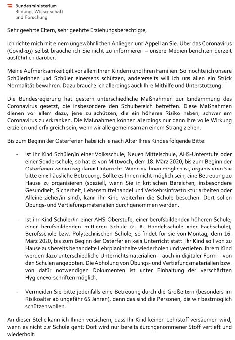 Elternbrief des Herrn Bundesminsters März 13, 2020 März 13, 2020 / Von Daniela Mühlleitner / Uncategorized / Kommentar verfassen