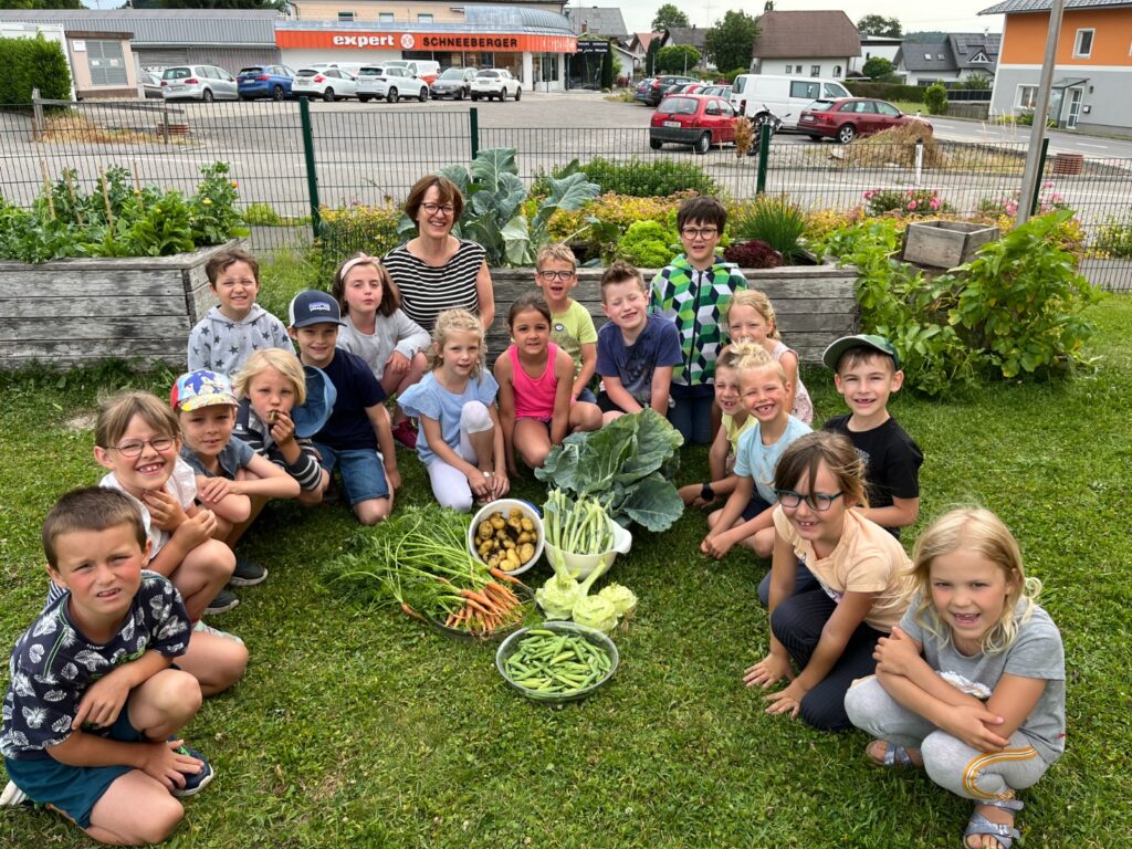 Über eine reichhaltige Ernte aus dem Gemüsehochbeet freuten sich die Kinder der 1. Klasse. Besonderen Spaß machte den Schülerinnen und Schülern das Ausgraben der Frühkartoffeln und das Herausziehen der Karotten. Das Gemüse wurde in der Pause verspeist und beim Aktionsvormittag im Juni zu Fingerfood verarbeitet.