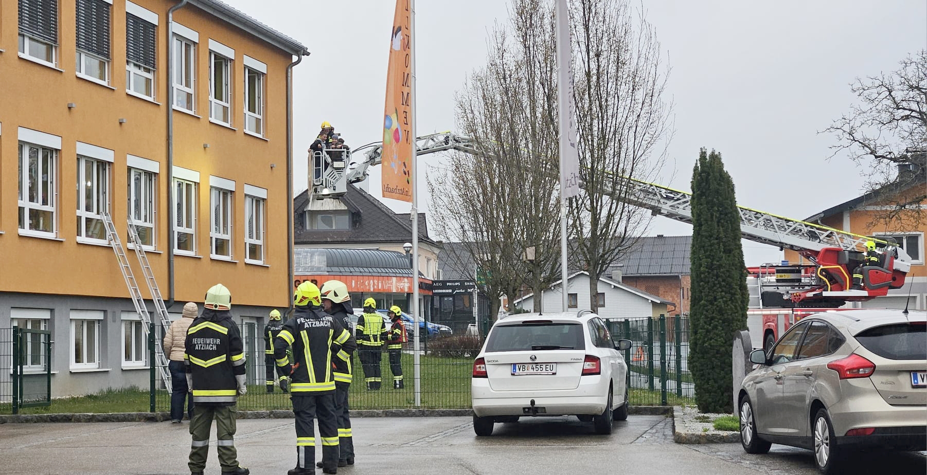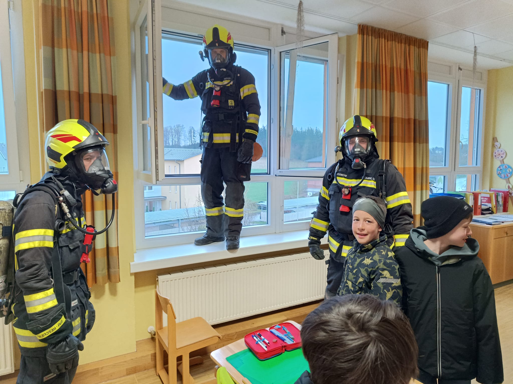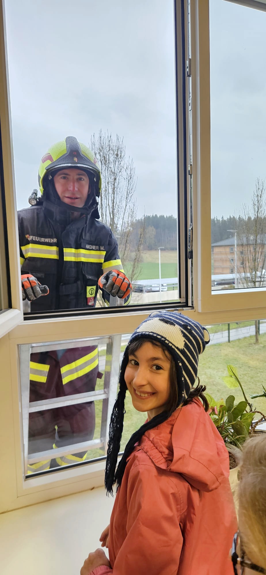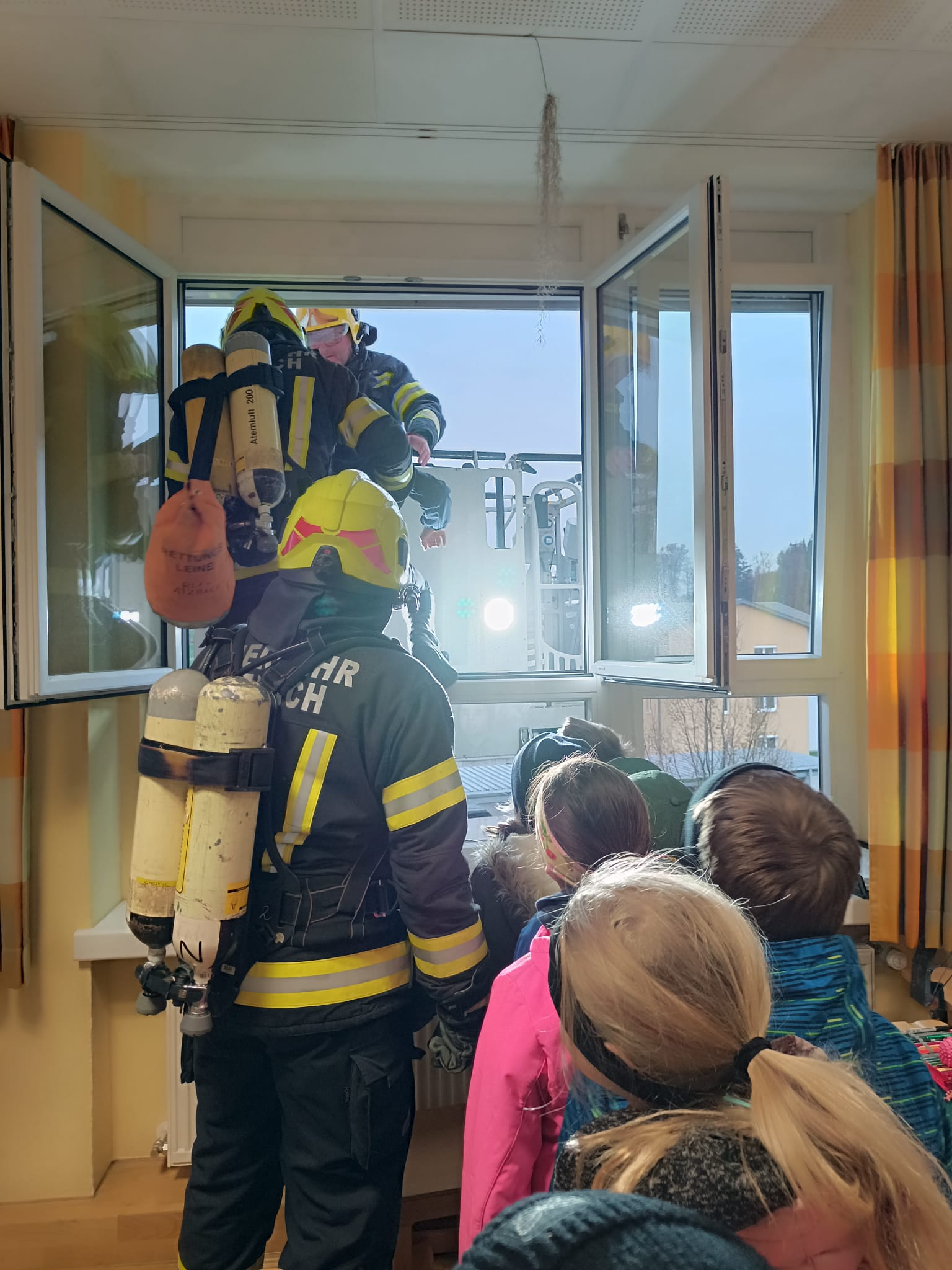 Am Freitag, 10. April waberte Rauch durch den Gang im oberen Stockwerk unserer Schule. Während 2 Klassen das Gebäude über die Treppen verließen, wurde die 3. Klasse im EG über angelehnte Leitern aus dem Zimmer geholt und die 4. Klasse gelangte mittels der ausfahrbaren Leiter und dem Korb vom 1. Stock hinunter in Sicherheit.